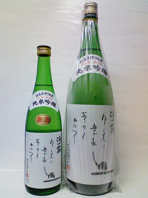 ラベルの「行く先に わが家ありけり かたつむり」とは、杜氏が酒造りの為に米を担いで向かう様をうたったもの。このお酒は杜氏手作りの米・兵庫北錦で丁寧に仕込まれたお酒をしぼってすぐに瓶詰め出荷した、フレッシュな旬の味を楽しめるやや辛口酒です。